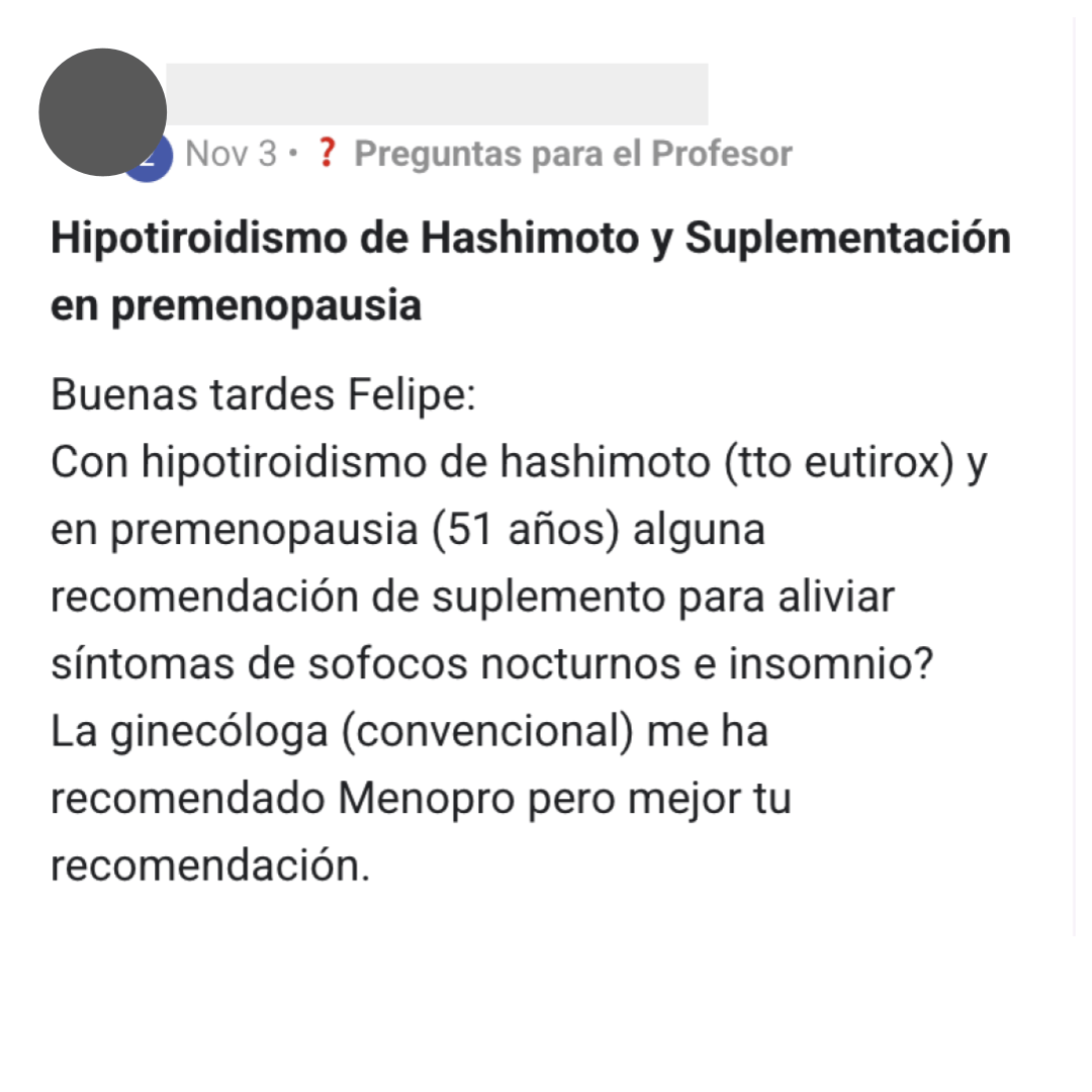 Puedes preguntar sobre alimentación, suplementación, manejo del estrés, hábitos, interpretación general de pruebas, dudas sobre estrategias complementarias, experiencias comunes en enfermedades autoinmunes o cómo aplicar mejor ciertas recomendaciones a tu caso concreto... Lo que se te ocurra en relación al manejo de tu enfermedad, desde un enfoque responsable y de sentido común.